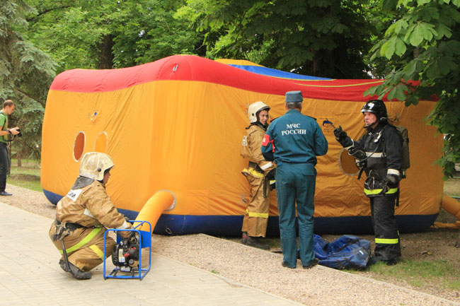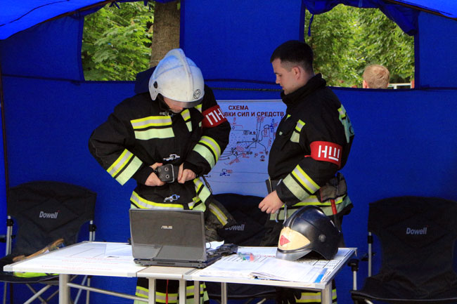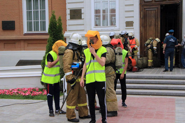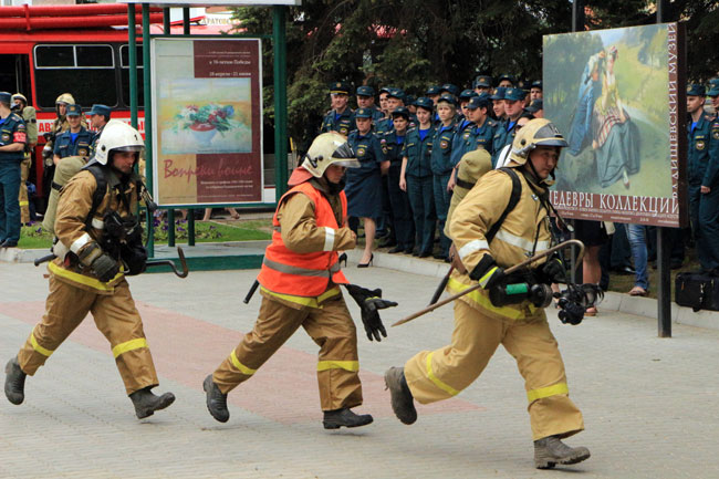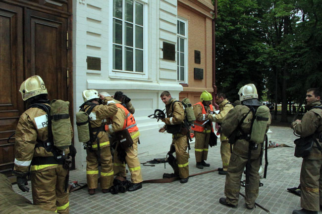 Во время учений наряду с традиционным оборудованием были задействованы воздушная противодымная завеса и пневматическое прыжковое устройство. Пожарные во время обследования «задымленного» музея обнаружили там несколько «пострадавших», которых выводили на улицу в специальных масках. Одному из них по легенде потребовалась помощь медиков.