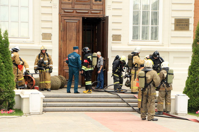 По легенде «возгорание» произошло в подвальном помещении музея, а на момент вызова пожарных в здании началась эвакуация, но несколько человек оставались внутри. Осложняло работу огнеборцев наличие ценных исторических картин, составляющих коллекцию музея.