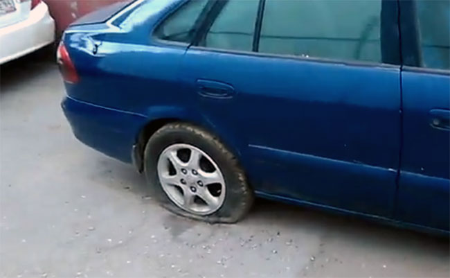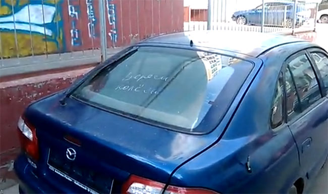 Раздосадованные люди попробовали воздействовать на автовладельца через акты вандализма, но это не помогает. В частности, на лобовом стекле белой краской написано «Пожарный проезд», а на заднем стекле – «Береги колеса». От слов перешли к действию: заднее колесо спущено, а правое зеркало отломали.