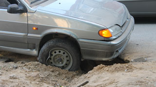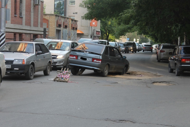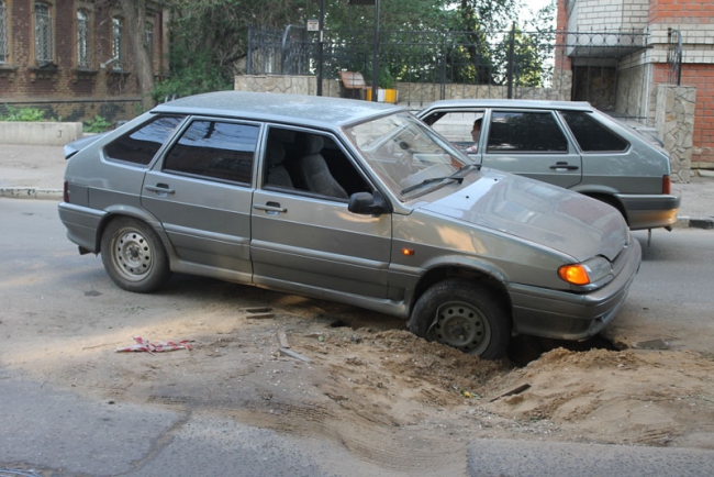 Около часа назад в Саратове на перекрестке улиц Лермонтова и Григорьева автомобиль «ВАЗ-2114» провалился передним колесом в яму. В связи с ДТП движение на этом участке затруднено.
