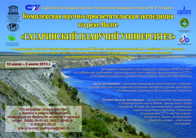 10 июня 2015 года СГТУ имени Ю.А.Гагарина начинает научно-просветительскую экспедицию «Гагаринский плавучий университет» с целью изучения взаимосвязи геологического строения, рельефа местности и развития поселений человека в долине реки Волги на территории Саратовско-Волгоградского Поволжья.