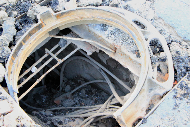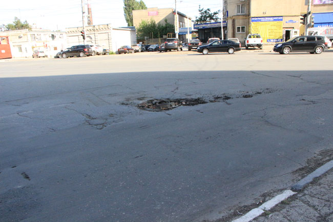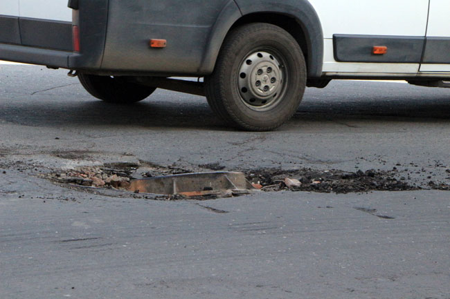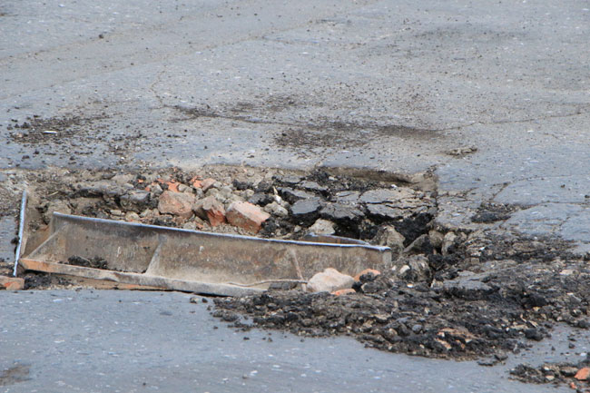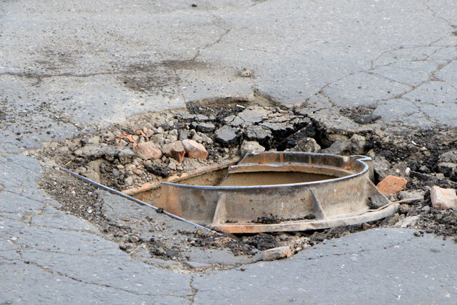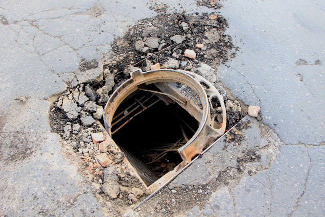 Когда образовался провал неизвестно, но теперь на месте люка обыкновенная яма, а железный каркас выскочил из асфальта, угрожая колесам автомобилей. Вокруг него также повреждено дорожное покрытие. Крышка люка уцелела, но упала внутрь колодца.