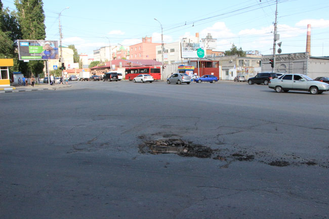 На перекрестке улиц Чернышевского и 2-й Садовой в Саратове провалившийся люк мешает движению транспорта. Разрушенная конструкция ничем не огорожена.
