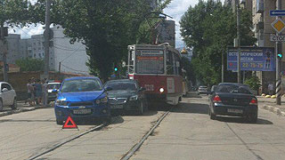 По их данным, следуя по Советской, легковой автомобиль (предположительно, «Ниссан») выехал на трамвайные рельсы и врезался в заднюю часть «Шевроле». В это же время на данном участке дороги в сторону Мирного переулка двигался трамвай маршрута №10, водитель которого протаранил сзади первую легковушку.
