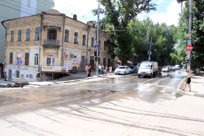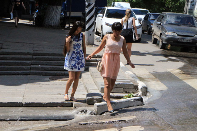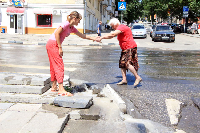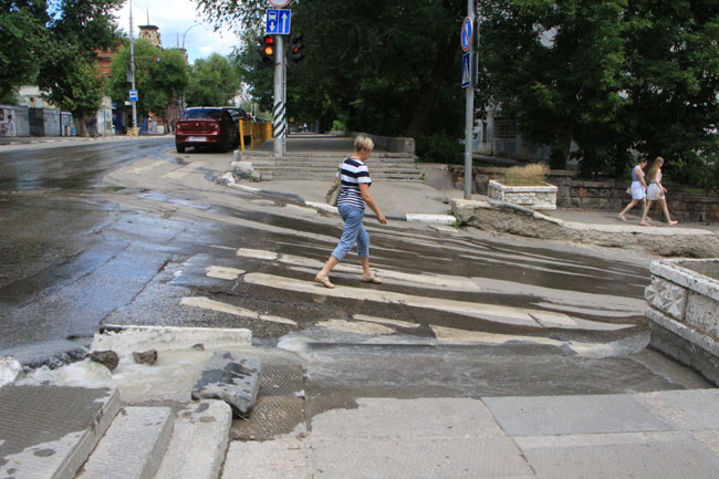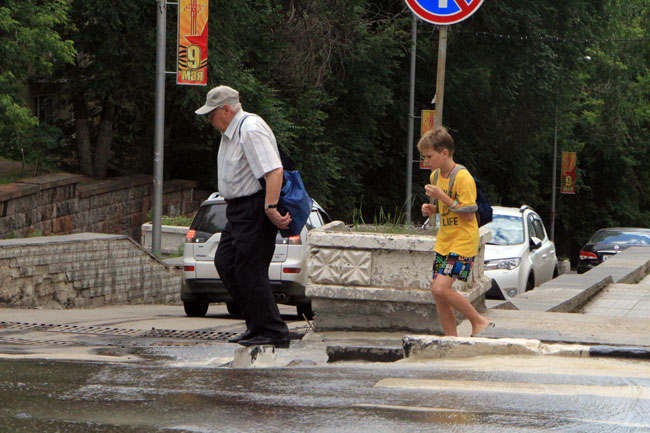 Затем потоки сливаются по Чернышевского к набережной, где попадают в ливневую канализацию. Из-за разлива воды практически невозможно перейти дорогу именно в той стороне, где располагается остановка общественного транспорта по направлению к Музейной площади. Из этой ситуации горожане находят разные пути выхода: кто-то пытается аккуратно перепрыгнуть по луже, кто-то пересекает дорогу в неположенном месте.