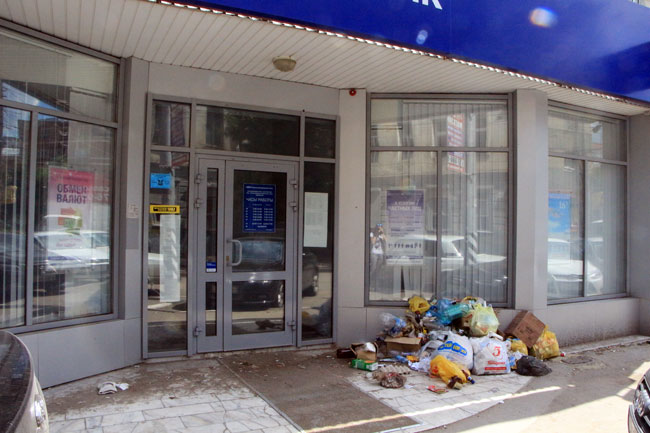 Мусор плавно перекочевывает на узкий тротуар, где десятки горожан ходят в соседний супермаркет. По словам жильцов окрестных домов, сейчас «Транснациональный банк» данное помещение не занимает.