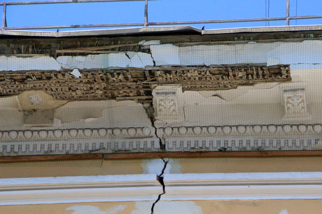 Сейчас у входа в библиотеку наблюдается значительная трещина, поразившая фасад от карниза до основания. Ее диаметр составляет примерно 1-1,5 см. Помимо этого, у крыши разрушается карниз, и чтобы его обломки не попадали на прохожих, по периметру натянута строительная сетка.