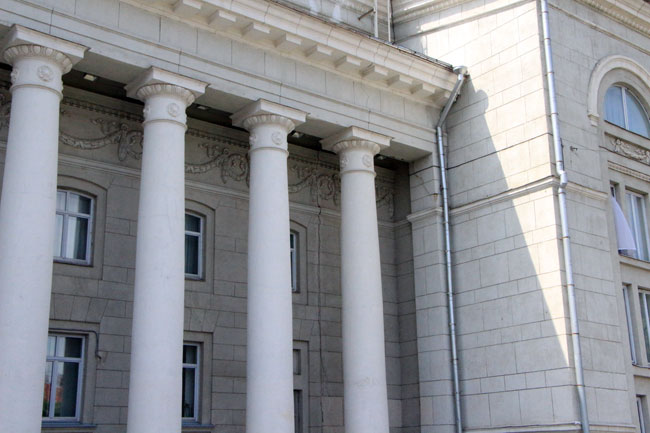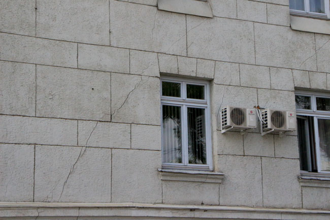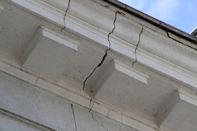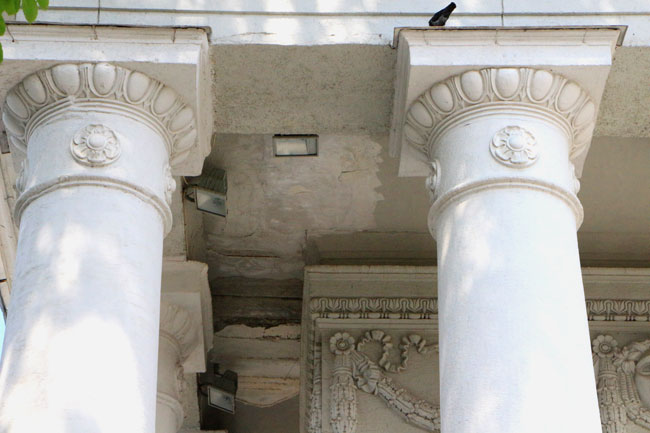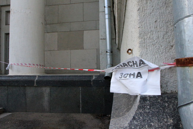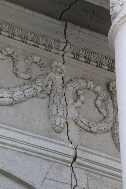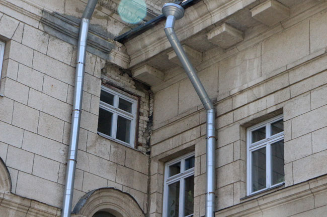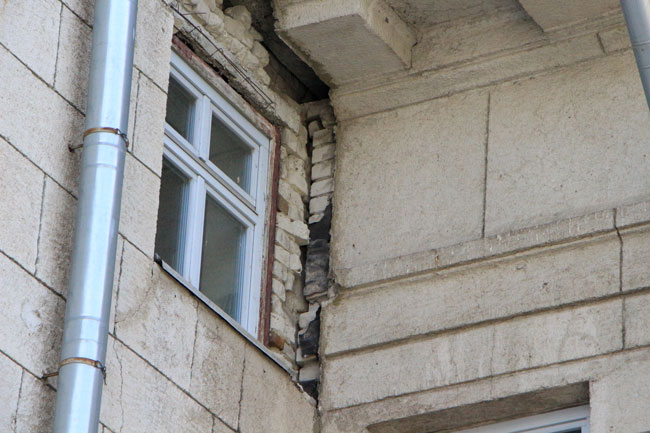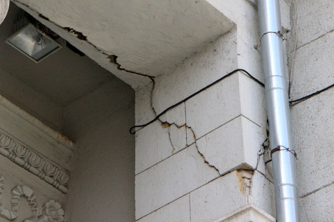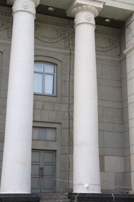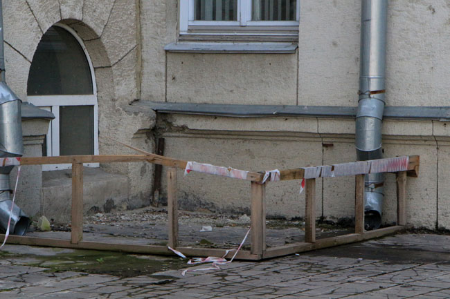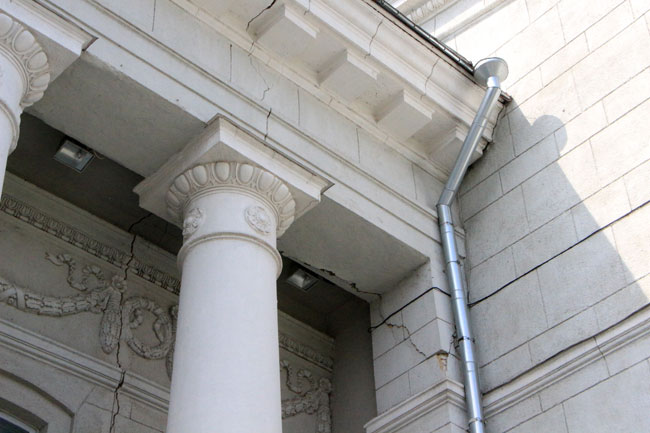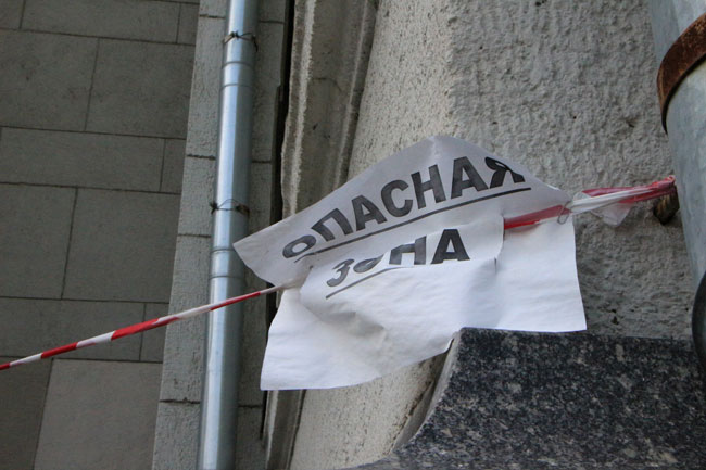 Наиболее угрожающе выглядит трещина длиной несколько метров со стороны главной городской площади, по которой ежедневно проходят сотни горожан. Чтобы саратовцы не пострадали от падающей с фасада штукатурки, рядом натянута оградительная лента. К ней прикреплено две потрепанных бумажки с надписью: «Опасная зона».