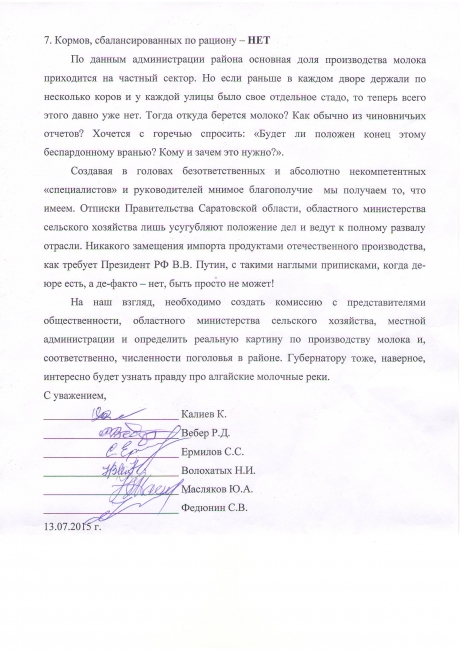 Районные власти, по утверждению авторов письма, отчитываются о том, что основное производство молока сосредоточено в личных подворьях. Но в последнее время, как отмечают подписанты, поголовье коров резко сократилось. «Тогда, откуда берется молоко? Как обычно из чиновничьих отчетов? Хочется с горечью спросить: «Будет ли положен конец этому беспардонному вранью? Кому и зачем это нужно? - спрашивают они. – Отписки правительства Саратовской области , областного министерства сельского хозяйства лишь усугубляют положение дел и ведут к полному развалу отрасли».