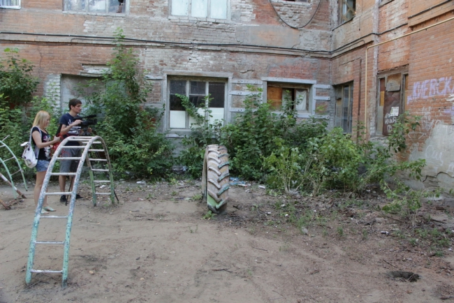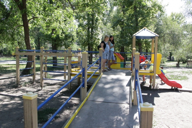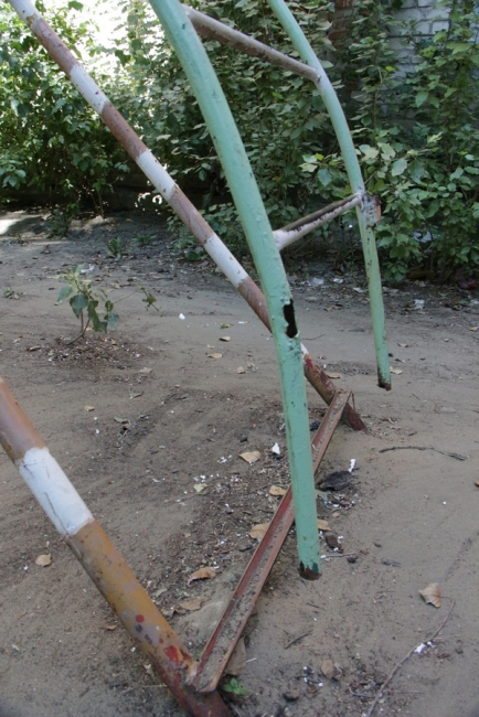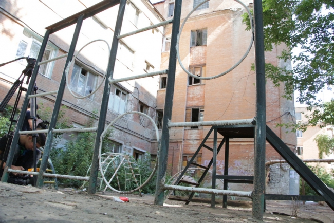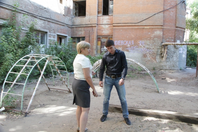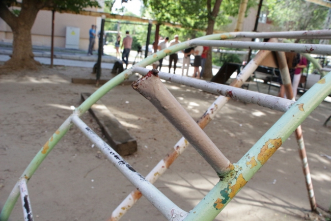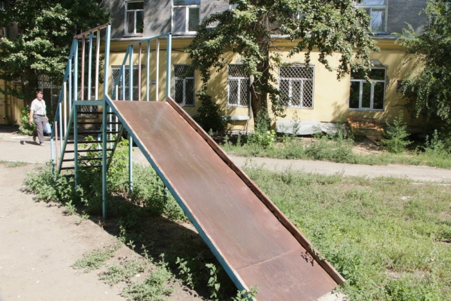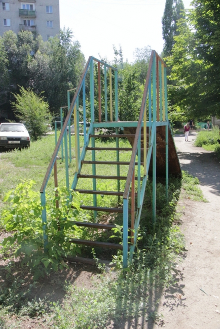 Первым пунктом, где сделала остановку детский омбудсмен, стала площадка у дома 10 на улице Киевская. Адрес был выбран неслучайно, жители дома специально обратились к Татьяне Загородней за помощью по наведению порядка на детской площадке. У дома проверяющая увидела старые металлические конструкции, изображающие лесенки и горки, на которых облезла краска, торчат металлические штыри.