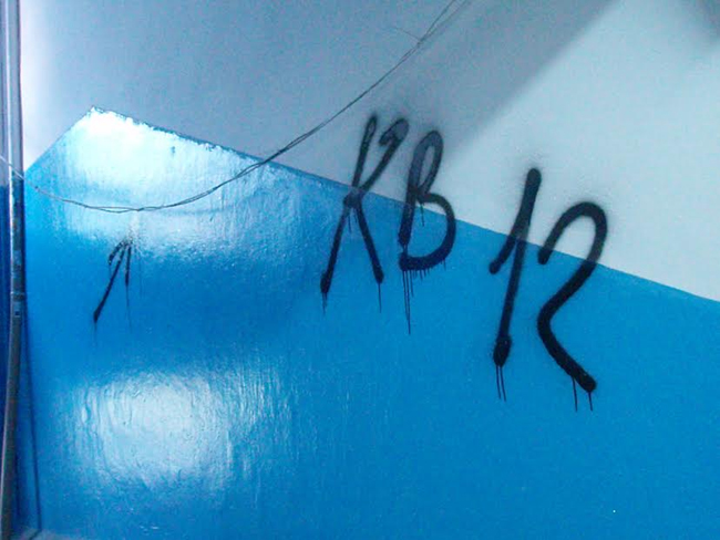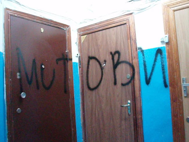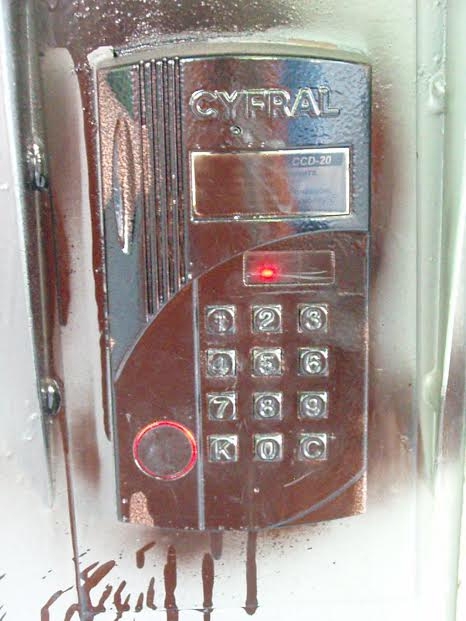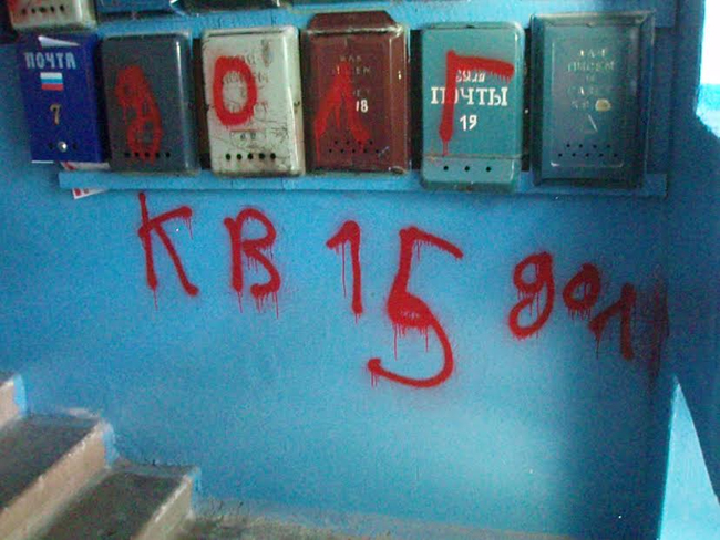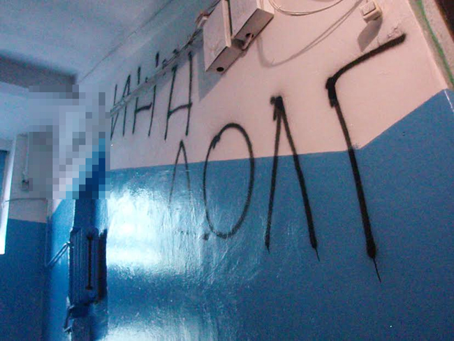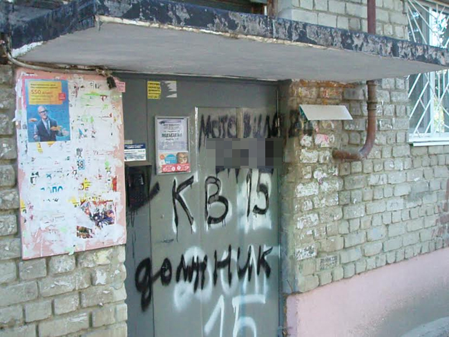 Стены подъезда с первого до пятого этажа исписаны номерами квартир и фамилиями «должников» и нецензурщиной. Изрисованы двери квартир, почтовые ящики, отрезаны провода Интернета и кабельного телевидения. Залит черной краской и практически приведен в нерабочее состояние домофон, испорчена дверь подъезда.