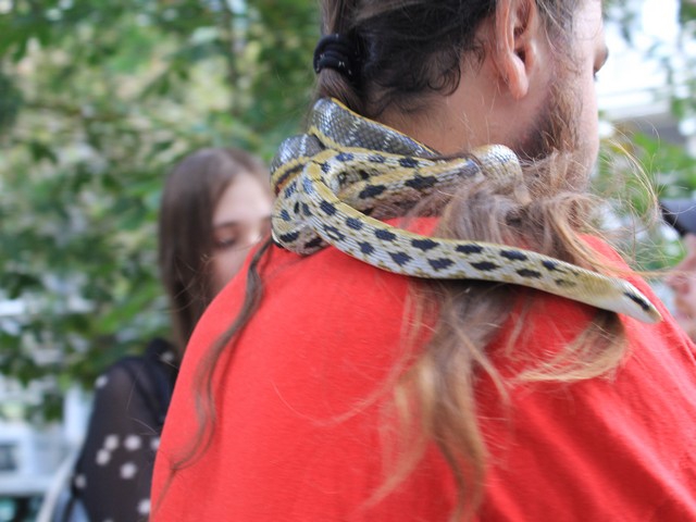 Поддержать общественников пришли владельцы экзотических животных. Саратовцам предлагали за символическую плату сфотографироваться с ушастой совой по имени Плюшка, а также с парочкой обаятельных змей.