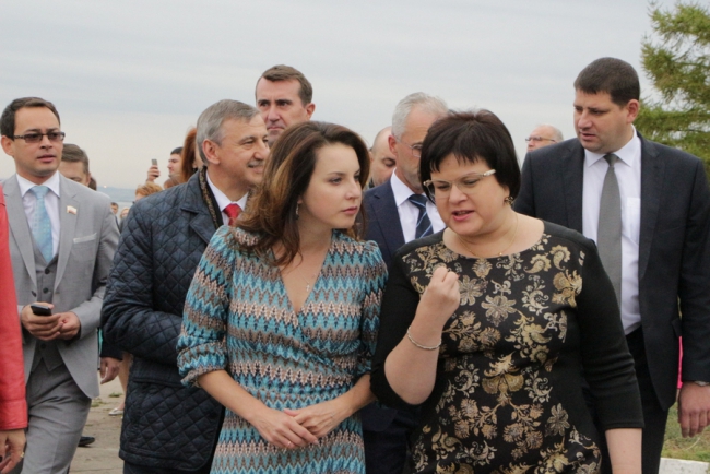 Далее делегация проследовала к памятнику, где должна состояться спортивная зарядка под руководством Ирины Слуцкой.
