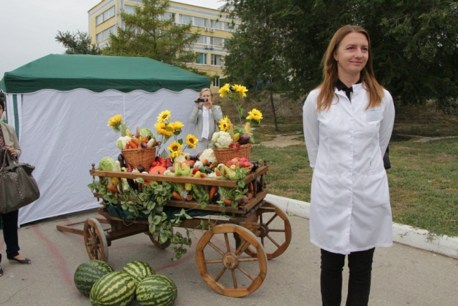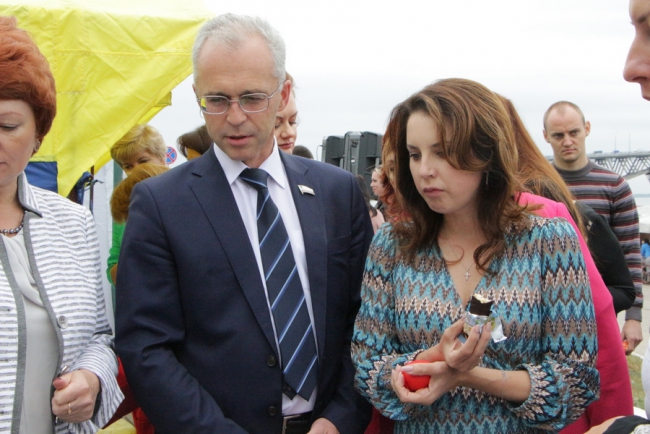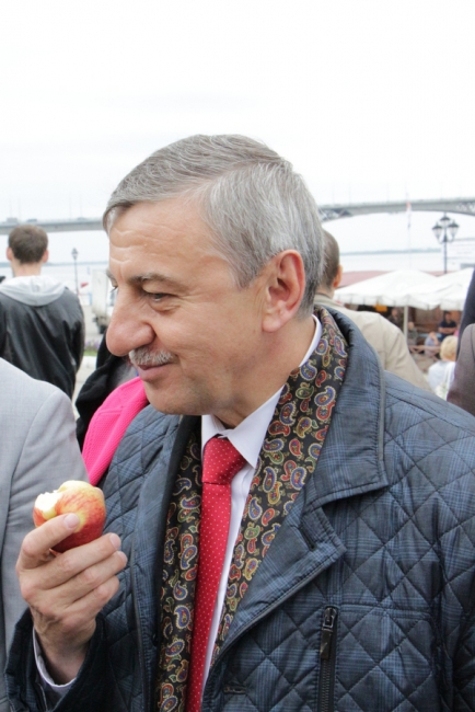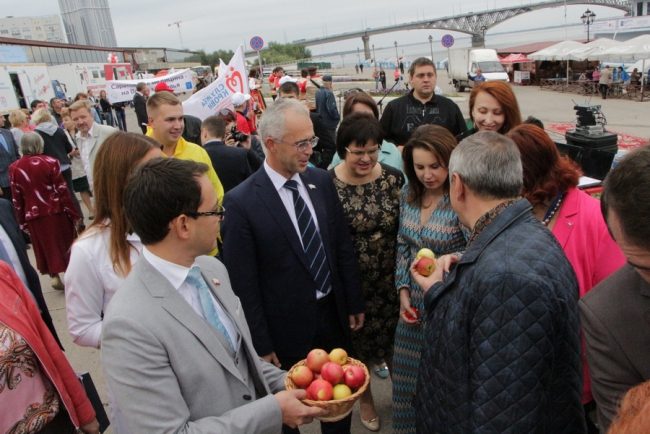 Николай Кононов, стоя напротив тележки с обилием саратовских овощей и фруктов, не удержался и попросил отведать яблоки из Хвалынска. На что ему протянули сразу целую чашу фруктов, которыми он поделился со Слуцкой.