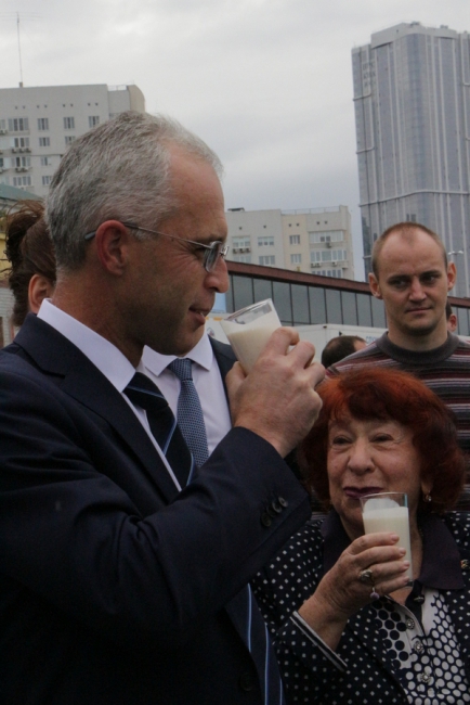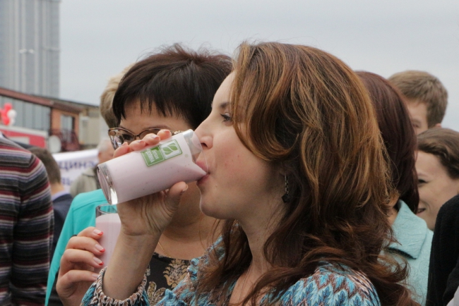 Далее они проследовали к палаткам с молочными продуктами, где им также предложили попробовать йогурт, мороженое и сладкие сырки местных производителей.