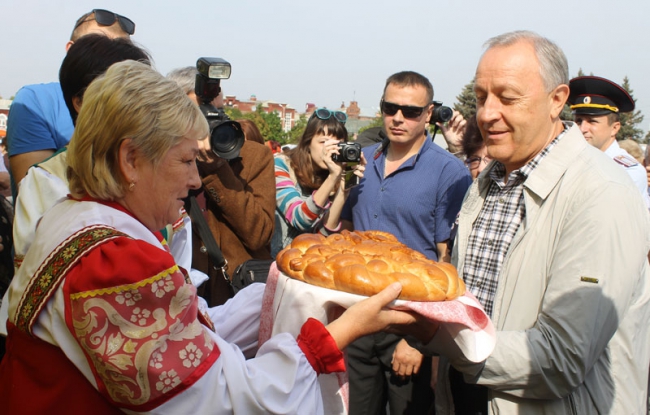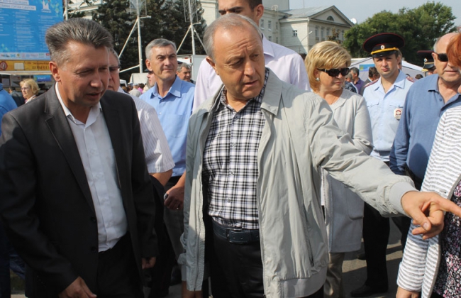 Губернатор никаких речей не говорил, он прошел по рядам ярмарки, где ему вручили большой каравай, который, прежде чем принять, Радаев поцеловал, и несколько банок с грибами и вареньем.