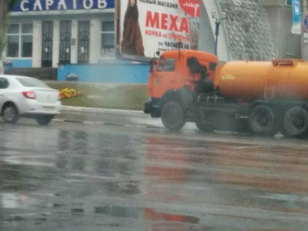 На снимках видно, что во время дождя поливочная машина мыла тротуар рядом с бассейном «Саратов». Горожанин Александр Чеширский, являющийся автором изображений, выразил недоумение по этому поводу: «Утро, ливень. Дорожники моют дорогу».
