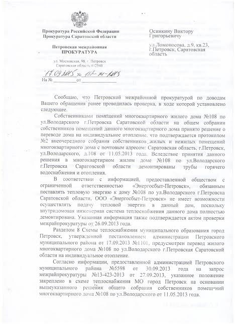 «Таким образом, в результате бездействия администрации Петровского муниципального района жители квартир №1а, 12 многоквартирного жилого дома №128 по ул. Володарского г. Петровска Саратовской области не будут обеспечены отоплением в осенне-зимний период 2014-2015 годов, чем будет нарушено их право на получение коммунальных услуг, а также может возникнуть угроза причинения вреда жителям указанных квартир.