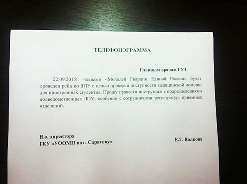 Лидер регионального отделения МГЕР Иван Дзюбан предоставил «Четвертой власти» фотографию телефонограммы от и.о. директора ГКУ СО «Управление по организации оказания медицинской помощи по Саратову» Елены Волковой. В нем говорится, что будет проведена проверка доступности медицинской помощи для иностранных студентов.
