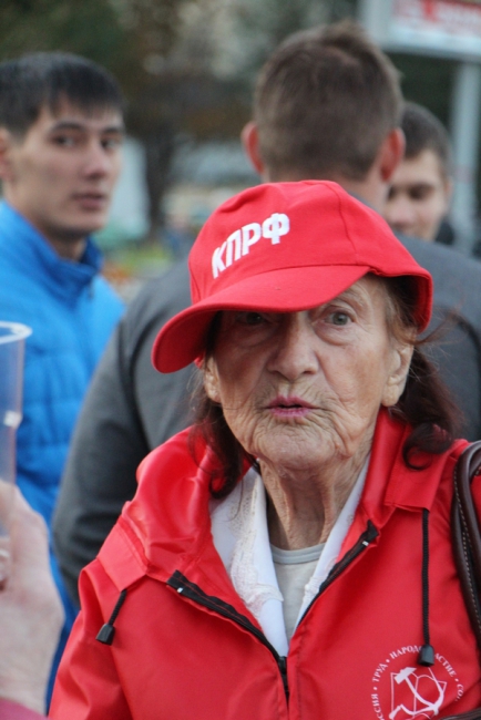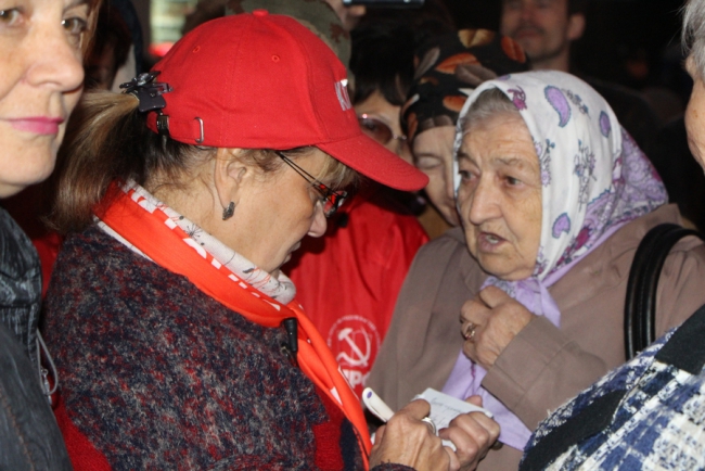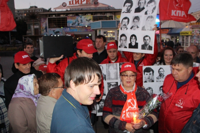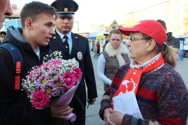 По окончанию встречи все ее участники почтили минутой молчания память погибших при расстреле Белого дома в Москве 3 октября 1993 года. Затем к депутату Алимовой продвинулся молодой коммунист с букетом из трех алых роз и преподнес его ей.
