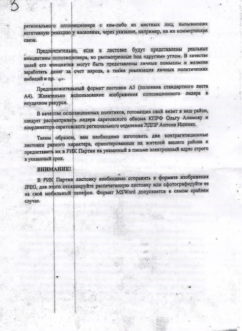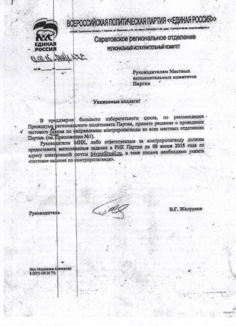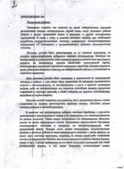 Документ якобы разработал региональный исполком «Единой России» в июне этого года, согласно нему местным исполкомам дается задание выпустить контрагитационную листовку. «Уважаемые коллеги, как известно во время избирательных кампаний региональные лидеры оппозиционных партий очень часто посещают районы области с целью проведения встреч с жителями и других агитационных мероприятий. В связи с этим в качестве тестового задания вам необходимо разработать контрагитационную листовку, содержащую компрометирующую информацию по отношению к намеревающемуся приехать оппозиционному политику», - написано в обращении.