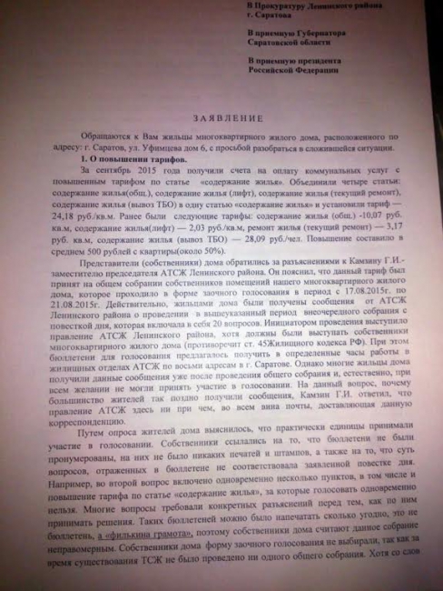 Жители многоквартирного дома №6 по улице Уфимцева в Ленинском районе Саратова готовят жалобу в прокуратуру на управляющую организацию за резкое повышение коммунальных тарифов. Копию своего обращения они также прислали в редакцию «Четвертой власти».