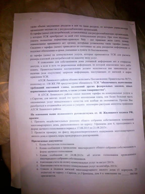 «Путем опроса жителей дома выяснилось, что лишь единицы принимали участие в голосовании. Собственники ссылались на то, что бюллетени не были пронумерованы, на них не было никаких печатей и штампов, а также на то, что суть вопросов, отраженных в бюллетени не соответствовала заявленной повестке дня. Например, во второй вопрос включено одновременно несколько пунктов, в том числе и повышение тарифа по статье «содержание жилья», за которые голосовать одновременно нельзя. Многие вопросы требовали конкретных разъяснений перед тем, как по ним принимать решения. Таких бюллетеней можно было напечатать сколько угодно, это не бюллетень, а «филькина грамота», поэтому собственники дома считают данное собрание неправомерным», - сообщили в своем заявлении саратовцы.