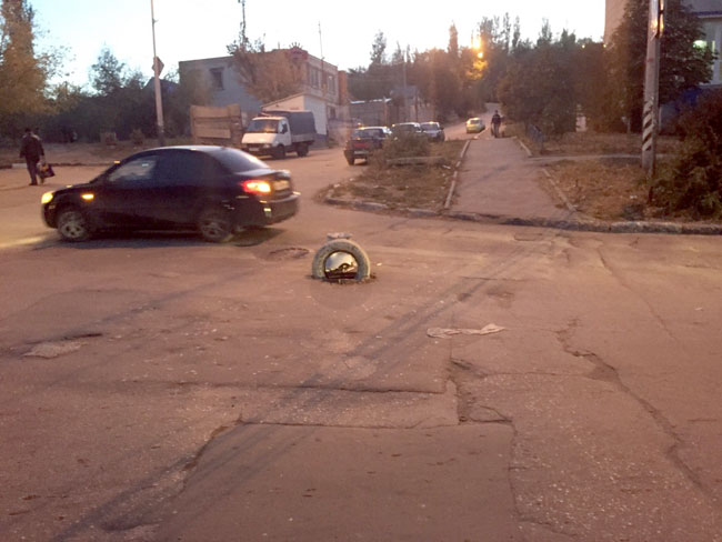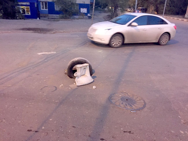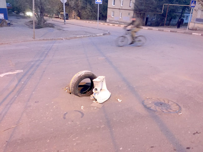 На месте провалившегося канализационного колодца на пересечении улиц Деловая и Лунная горожане создали своеобразную инсталляцию в качестве предупреждающего знака. Рядом с дорожным препятствием посреди проезжей части саратовцы установили разбитый унитаз, а в сам колодец воткнули старую автомобильную покрышку.