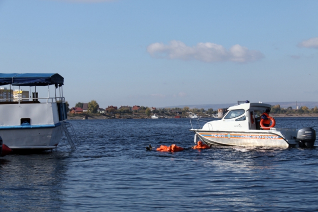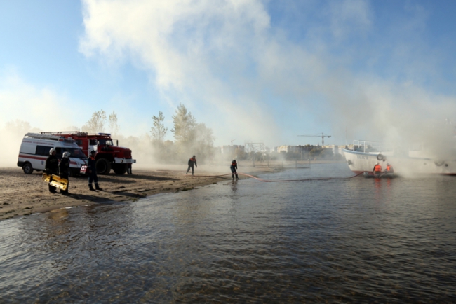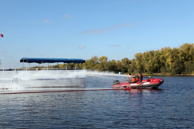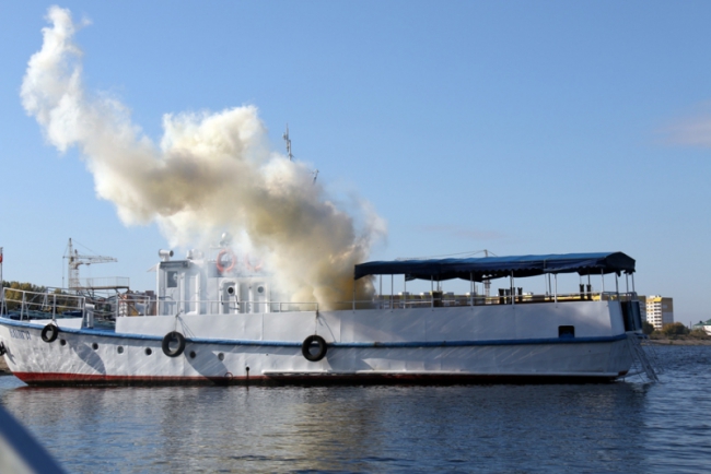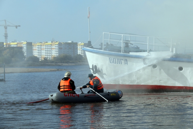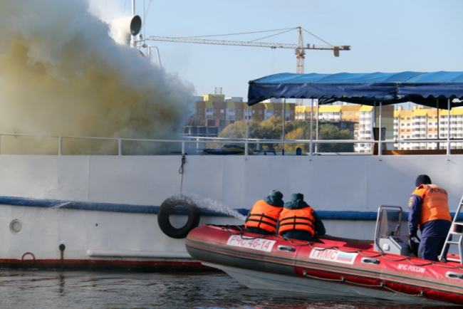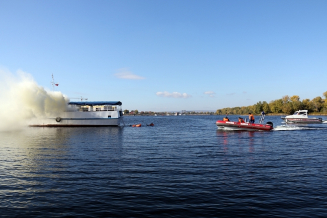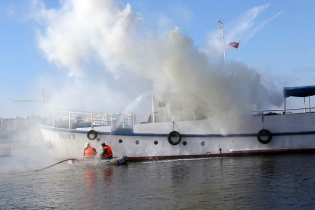 По второй легенде, произошло возгорание на корабле «Волга». В этот момент на палубе находились 6 человек, еще двое оказались в воде. К терпящему бедствие судну направились две лодки со спасателями. Одна из них эвакуировала людей с палубы, другая вытаскивала пострадавших из воды. Затем спасатели успешно ликвидировали учебное возгорание на «Волге».