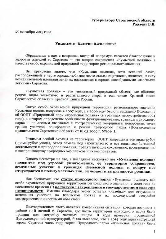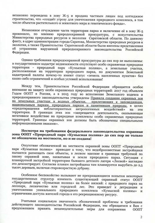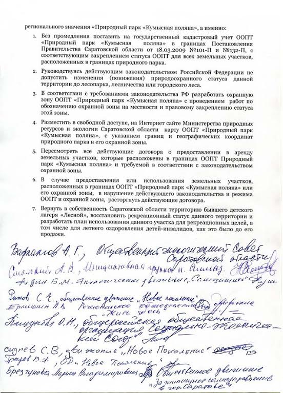 Валерия Радаева саратовцы просят «без промедления поставить на государственный кадастровый учет ООПТ «Природный парк «Кумысная поляна», разработать охранную зону особо охраняемой территории, вернуть в собственность Саратовской области территорию бывшего детского лагеря «Лесной» и так далее.