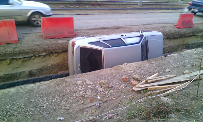 Легковушка свалилась на бок в раскопанную на Огородной траншею