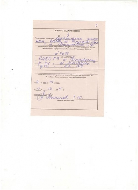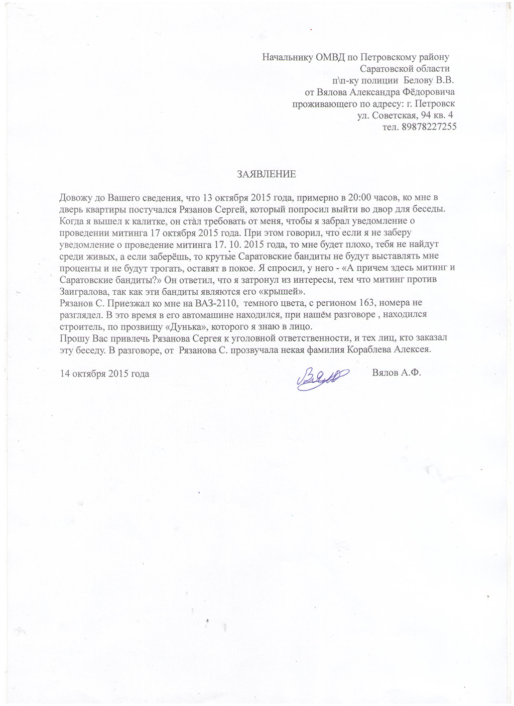 В заявлении он указывает, что 13 октября его из дома вызвал для беседы некий Сергей Рязанов. «Он начал требовать от меня, чтобы я забрал уведомление о проведении митинга 17 октября 2015 года. При этом он говорил, что если я не заберу уведомление о проведении митинга 17.10.15 года, то мне будет плохо, тебя не найдут среди живых, а если заберешь, то крутые Саратовские бандиты не будут выставлять мне проценты и не будут трогать, оставят в покое», - сообщает житель Петровска в своем заявлении.