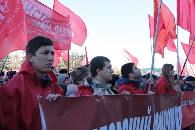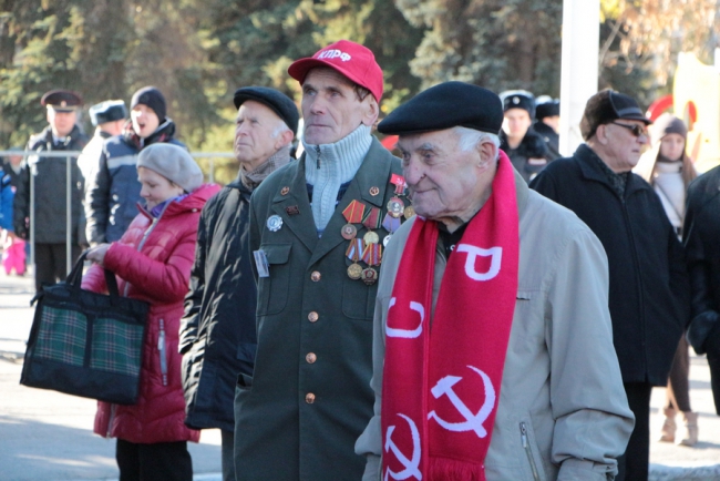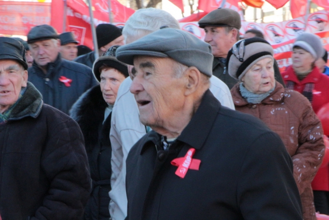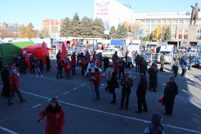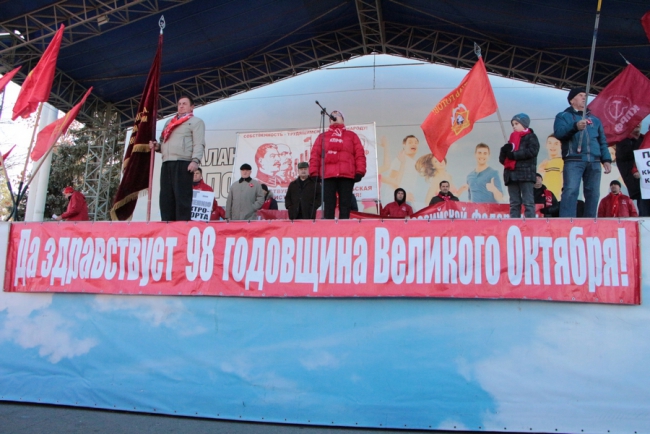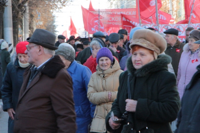 Сегодня утром на Театральной площади Саратова состоялся митинг в честь 98-й годовщины Великой Октябрьской революции. Мероприятие организовал обком КПРФ и началось оно с традиционного шествия от Крытого рынка. По данным полиции, собралось около 500 человек.
