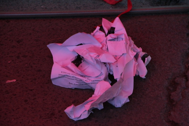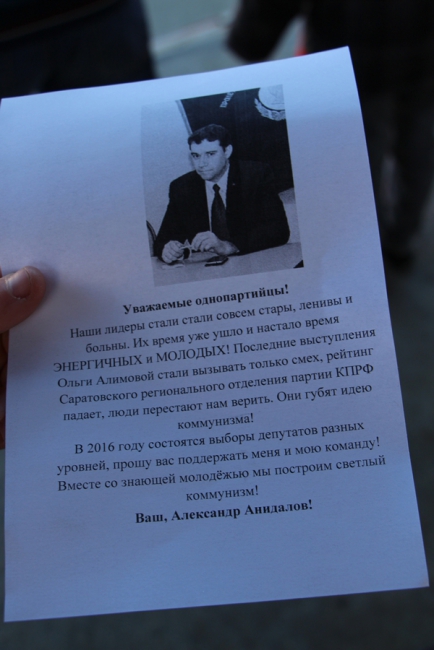 Кроме того, перед началом митинга неизвестные разбросали по асфальту листовки провокационного характера, написанные якобы от имени Александра Анидалова и дискредитирующие Алимову и «старых» лидеров обкома.