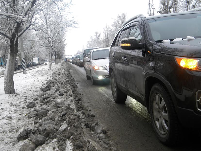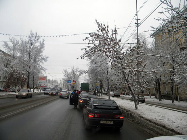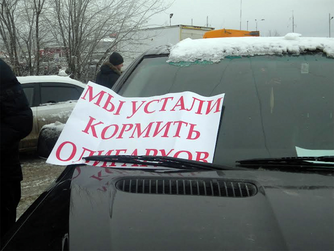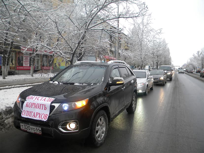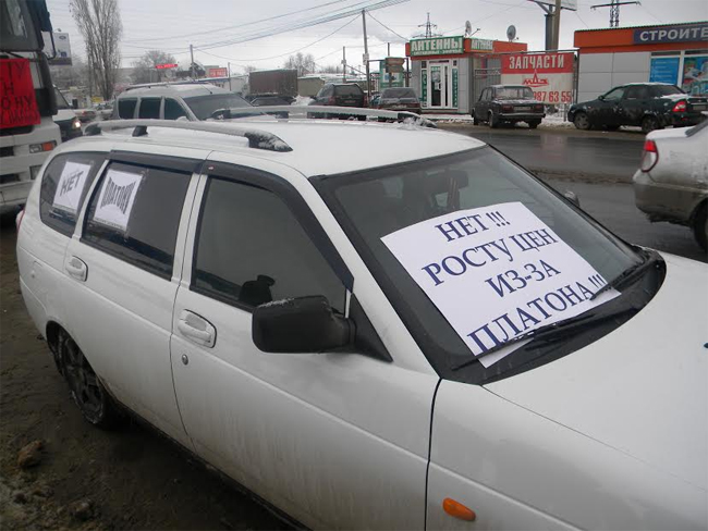 У всех транспортных средств включены аварийные сигналы, ход колонны сопровождается звуками клаксонов. Вместо плакатов – наклейки из обычных листов форматов А4 - А2 с сообщениями против введения платы за проезд и «Платона» (название системы по составлению маршрутов и приему платежей стало символом протеста). Автомобили очень медленно, правым рядом едут по проспекту Строителей, от Тархова до НИИ, на кольце они развернутся и отправятся обратно.