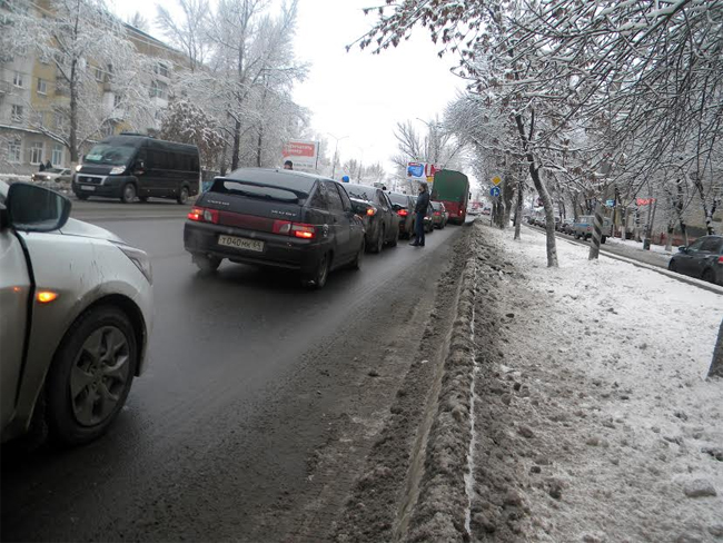 В эти минуты в Ленинском районе Саратова проходит автопробег, в котором участвуют водители большегрузных автомобилей. В образованной колонне 35 машин, первой движется фура, следом легковушки.