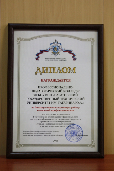 Кроме того, ППК СГТУ им. Гагарина Ю.А. был отмечен дипломом Минобрнауки РФ за «большую организационную работу и высокий профессионализм» по результатам проведения в 2015 году Всероссийских олимпиад профмастерства. В рамках олимпиады были определены лучшие площадки, и работа гагаринского колледжа по организации и проведению Всероссийской олимпиады по специальности СПО «Информационная безопасность автоматизированных систем» была также высоко оценена Департаментом госполитики в сфере подготовки рабочих кадров и ДПО Минобрнауки Российской Федерации.