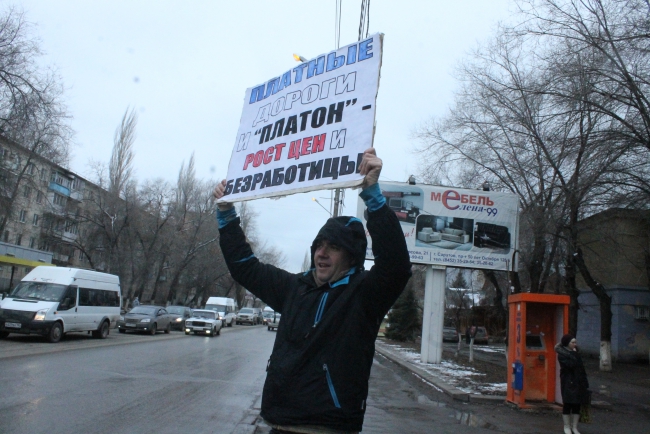 Там же на улице Тельмана проводит одиночный пикет секретарь горкома КПРФ Александр Анидалов. Он держит в руке плакат – «Платные дороги и «Платон» - рост цен и безработица».