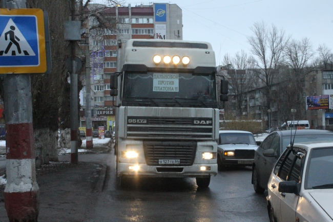 Мимо протестующих проехала фура с плакатом «Дальнобойщики против «Платона».