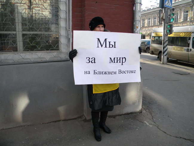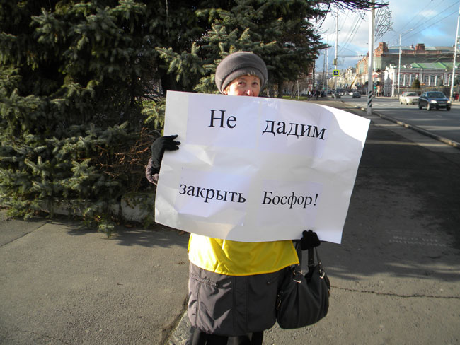 В рамках мероприятия три человека на расстоянии 50 метров друг от друга выстроились вдоль улицы Московская. Они держат в руках плакаты «Мы за мир на Ближнем Востоке», «Не дадим закрыть Босфор» и «Эрдоган, мы не забудем погибшего летчика».