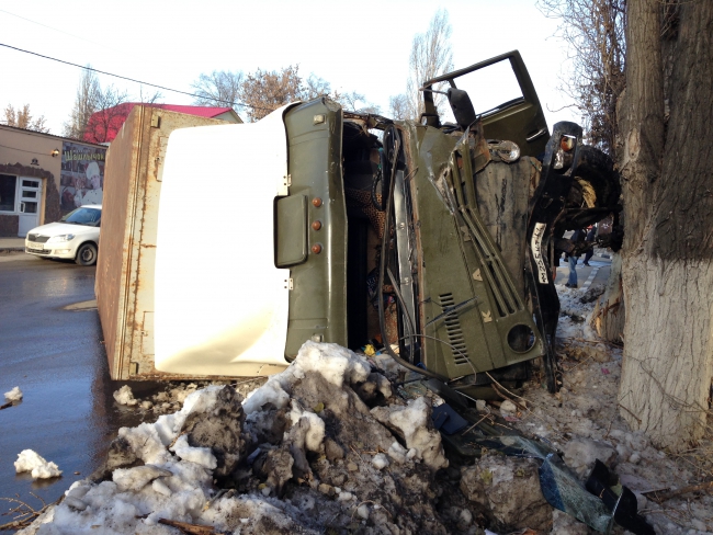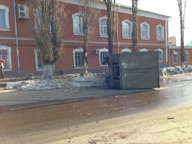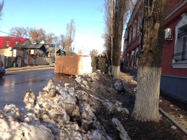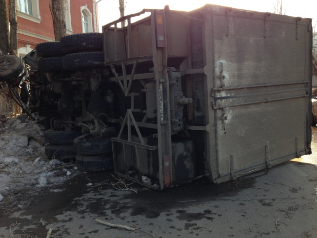 Сегодня в Саратове на улице Симбирской (недалеко от пересечения с Большой Горной) перевернулся грузовик «КамАЗ».