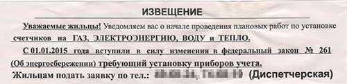 Напомним, жители Ленинского района Саратова пожаловались в «4В» на объявления частной организации об установке счетчиков на газ, электричество, воду и тепло. Граждане посетовали, что многим, особенно старикам, не под силу разобраться самостоятельно в двусмысленных формулировках, где требования закона смешаны с корыстными интересами. В извещениях безапелляционно заявляется о требовании установки счетчиков. Но при звонке корреспондента «4В» по указанному телефону диспетчер сообщила лишь о рекомендациях установки приборов учета. Получается, что доверчивый саратовец рискует отдать деньги за услуги, полагая, что выполняет обязательное требование закона, хотя это не совсем так.