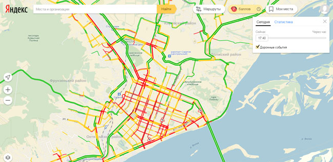 Сегодня вечером в Саратове наблюдаются серьезные автомобильные пробки. По системе Яндекса такая дорожная ситуация оценивается в 7 баллов.