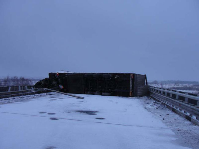 Дальнобойщик погиб, выпав из перевернувшегося на мосту грузовика
