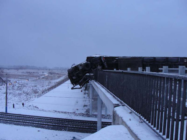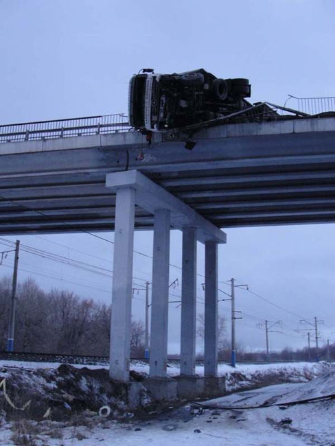 Он не справился с управлением, в результате чего грузовик опрокинулся, пробил ограждения и повис над путями.