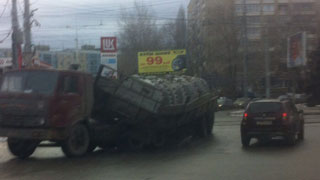 Сегодня в Саратове на границе Ленинского и Кировского района произошла авария с участие «КамАЗа». Груженный кирпичами грузовик около часа назад провалился колесом в яму на пересечении проспекта 50 лет Октября и улицы Техническая.