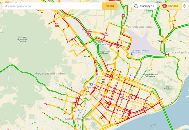 Сегодня вечером в Саратове наблюдаются серьезные пробки. Система Яндекс.Пробки оценивает текущую дорожную ситуацию в 7 баллов из 10.