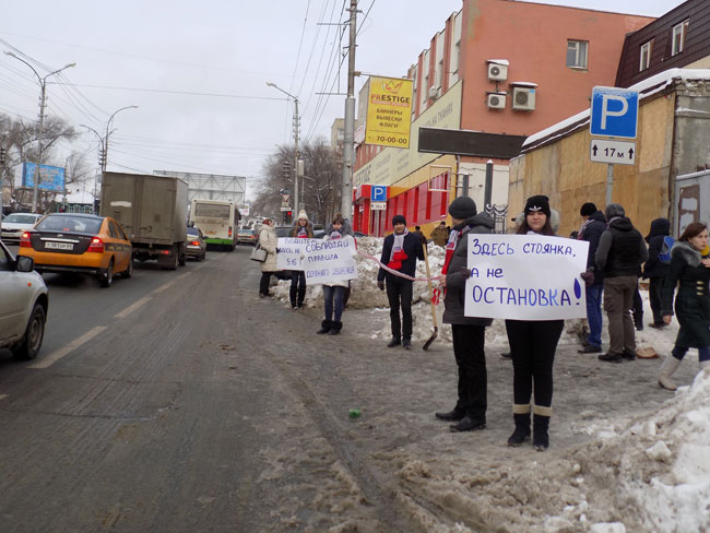 В ходе акции активисты растянули плакаты с надписями «Здесь стоянка, а не остановка», «Соблюдай правила дорожного движения», «Водитель, здесь нет знака 5.16 ПДД» (место остановки автобуса или троллейбуса, - ред.) и «Хотим остановку».