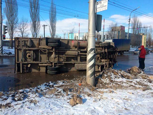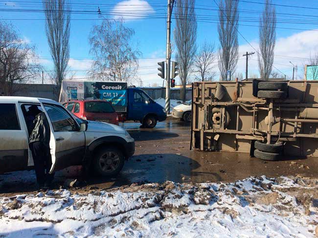 Сегодня утром в Ленинском районе Саратова грузовой автомобиль перевернулся в результате аварии.
