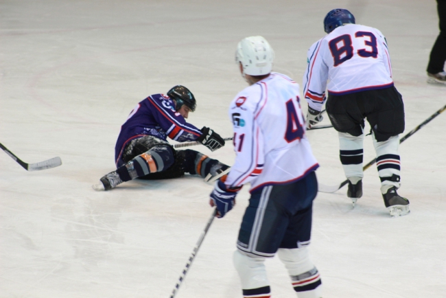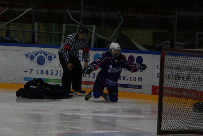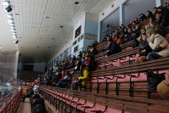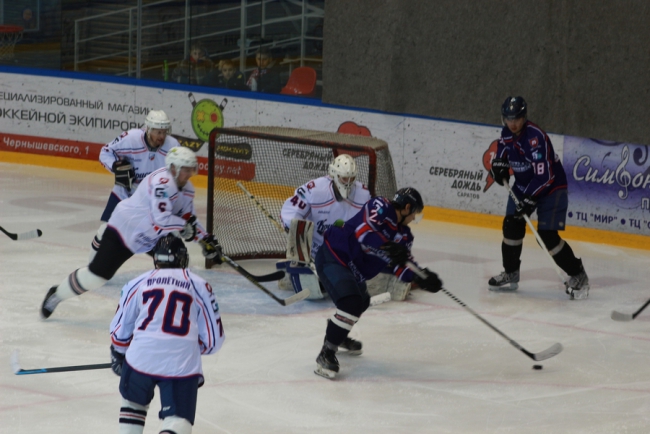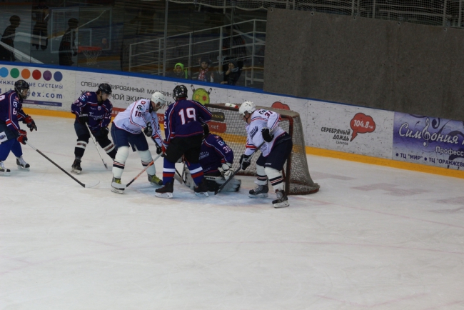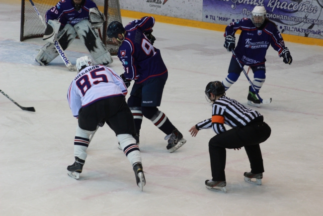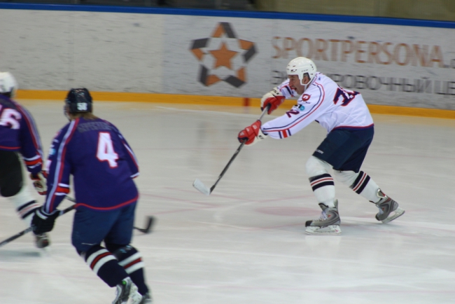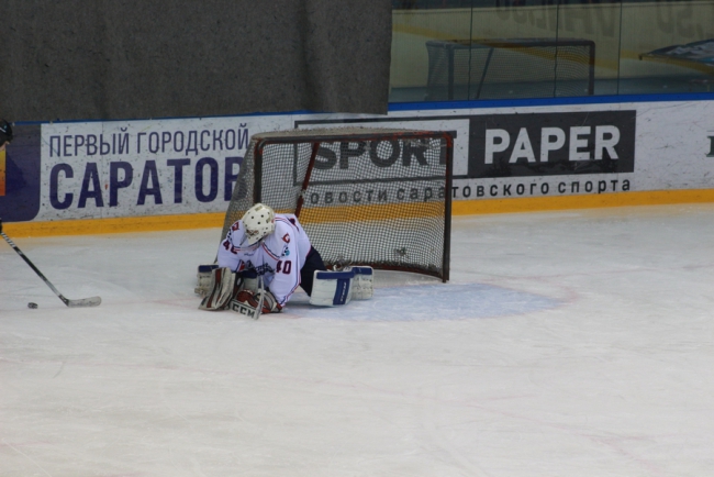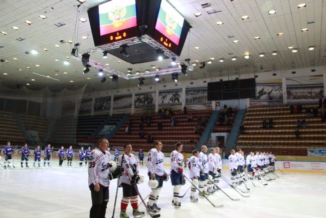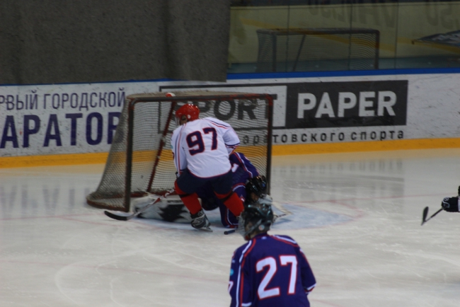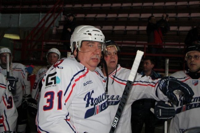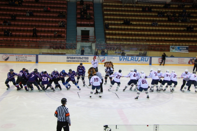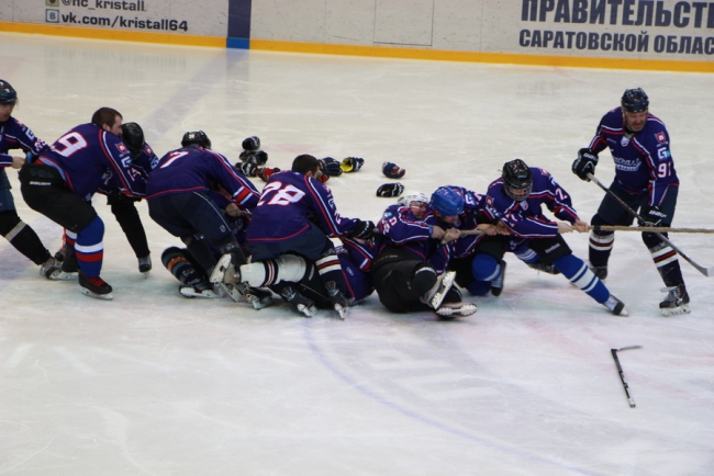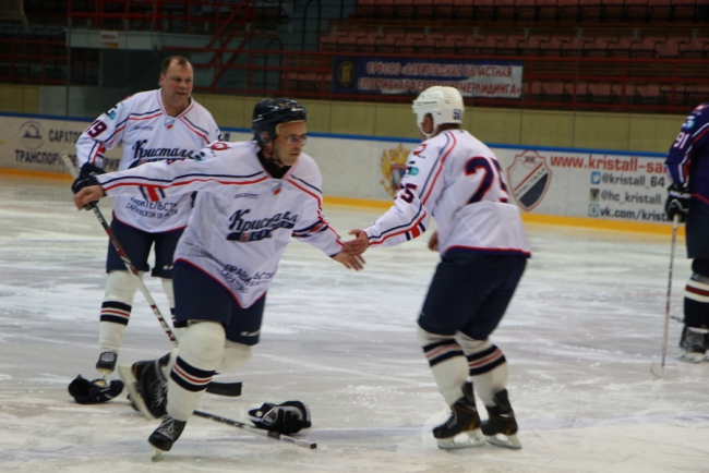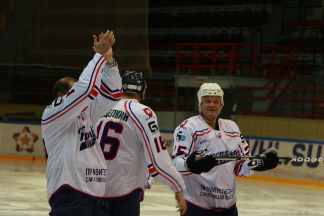 Сегодня в Саратове в «Кристалльном матче» хоккейная команда под условным названием «Руководство» победила «Болельщиков» (на фото в белой и синей форме соответственно).